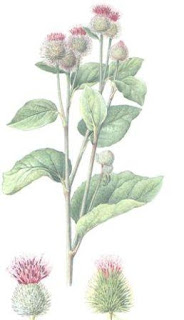 Nome popular: BARDANA Nome científico:Arctium lappa L. Família: Compostas Sinonímia popular: Gobô, orelha-de-gigante, bardana-maior Sinonímia científica: Lappa major Gaert. , Arctium majus Bernh. Parte usada: Raiz e folha Propriedades terapêuticas:Depurativa, diurética (eficaz eliminador do ácido úrico), colerética, laxativa, diaforética, anti-séptica, estomáquica, antidiabética, atua nos casos de insuficiência hepática, dermatoses, antibiótico externo principalmente para bactérias gram-positivas Princípios ativos: Óleo essencial até 0,2%, polifenóis, inulina 40 a 50%, mucilagens, lapatina, taninos, sais minerais, princípio antibiótico, ácido clorogênico, vitaminas do grupo B e A, fuquinona, glicosídeos, resina, cálcio, potássio, magnésio, princípio amargo Indicações terapêuticas:Purificador do sangue, afecções reumáticas, queda de cabelo, picadas de insetos, torções, hemorróidas, enfermidades crônicas da pele, acnes, eczemas, pruridos, seborréia da face, herpes, vesícula inflamada, cálculo biliar, hepatite viral, cirrose