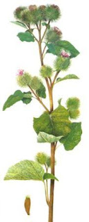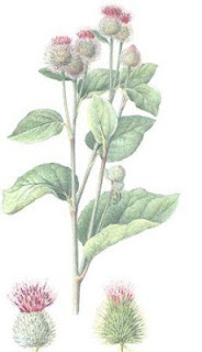 Nome popular: BARDANA Nome científico:Arctium lappa L. Família: Compostas Sinonímia popular: Gobô, orelha-de-gigante, bardana-maior Sinonímia científica: Lappa major Gaert. , Arctium majus Bernh. Parte usada: Raiz e folha Propriedades terapêuticas:Depurativa, diurética (eficaz eliminador do ácido úrico), colerética, laxativa, diaforética, anti-séptica, estomáquica, antidiabética, atua nos casos de insuficiência hepática, dermatoses, antibiótico externo principalmente para bactérias gram-positivas Princípios ativos: Óleo essencial até 0,2%, polifenóis, inulina 40 a 50%, mucilagens, lapatina, taninos, sais minerais, princípio antibiótico, ácido clorogênico, vitaminas do grupo B e A, fuquinona, glicosídeos, resina, cálcio, potássio, magnésio, princípio amargo Indicações terapêuticas:Purificador do sangue, afecções reumáticas, queda de cabelo, picadas de insetos, torções, hemorróidas, enfermidades crônicas da pele, acnes, eczemas, pruridos, seborréia da face, herpes, vesícula inflamada, cálculo biliar, hepatite viral, cirrose